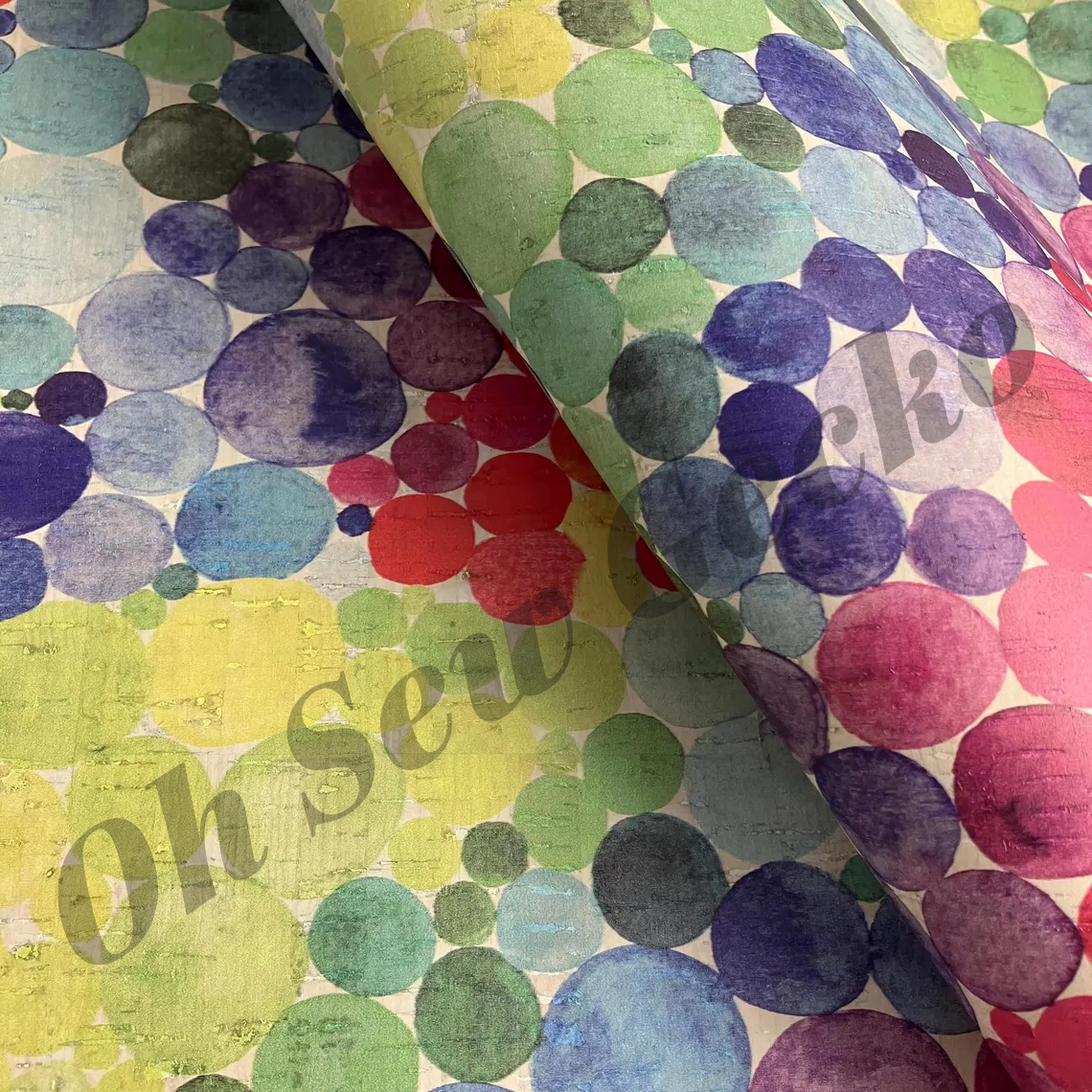 Multi-Coloured Bubbles on white rustic superior cork fabric